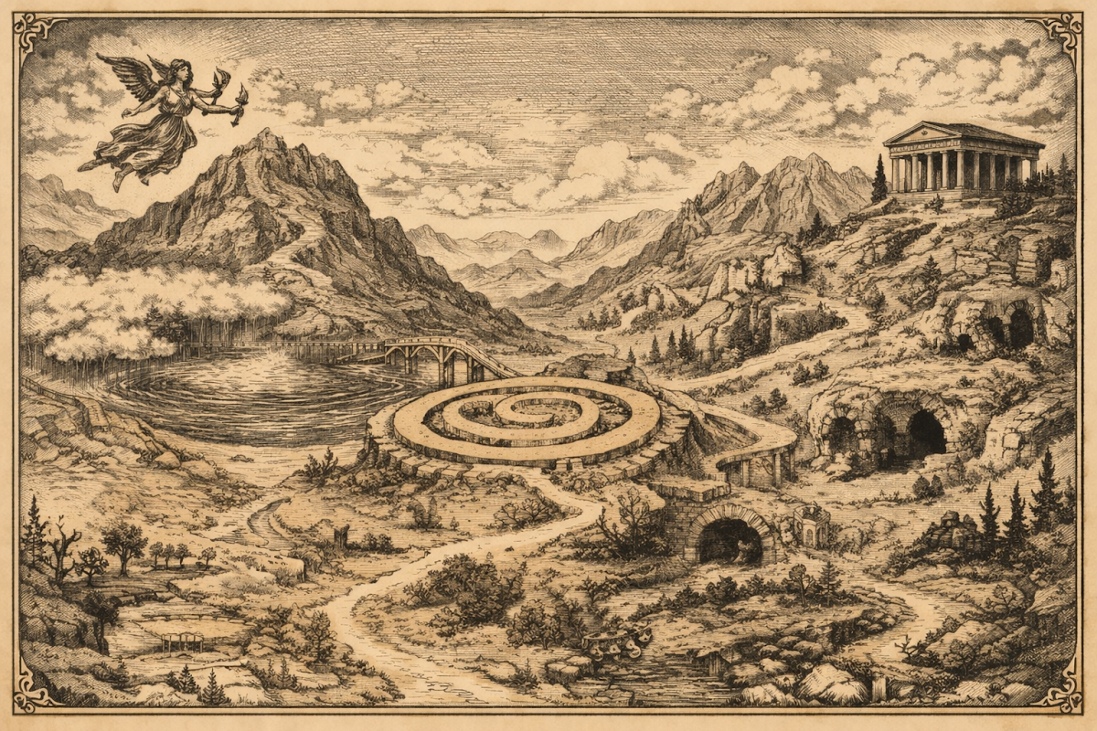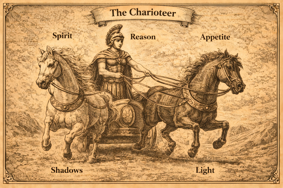 In the Phaedrus myth, Plato depicts the soul as a charioteer guiding two horses—one noble (spirit), one unruly (appetite). Virtue is the system state in which reason maintains control. It is not randomness suppressed but randomness governed.