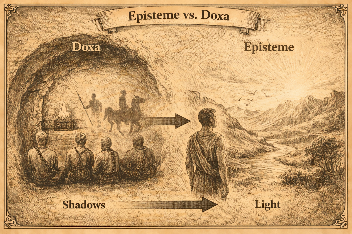 Kolmogorov separates stochastic risk (rigorously defined) from mere subjective unease. Plato separates episteme (knowledge grounded in definition and cause) from doxa (true opinion that happens to be correct but lacks grounding).