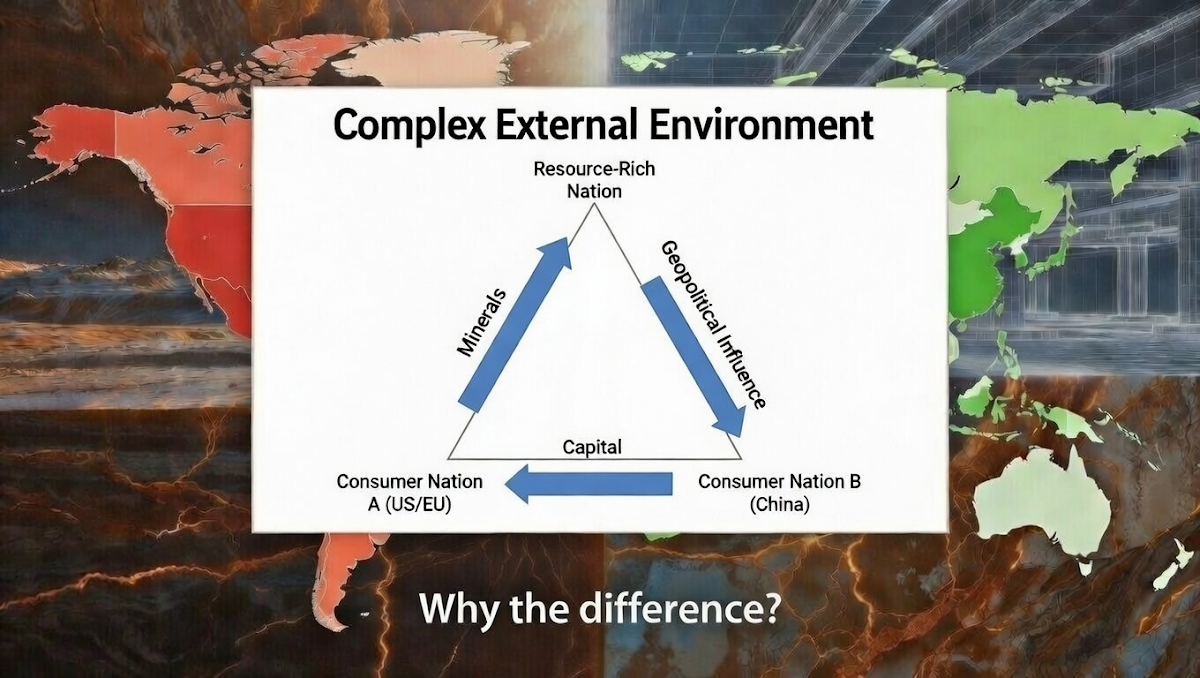 Their framework integrates two external dimensions often neglected in the literature. First, geopolitical competition between major powers, particularly the United States and China creates distinct opportunity structures and constraint sets for resource-rich nations. Second, the maturity of specific commodity markets is whether minerals are traded in liquid global markets or through opaque bilateral arrangementswhich fundamentally affects bargaining power and price discovery.