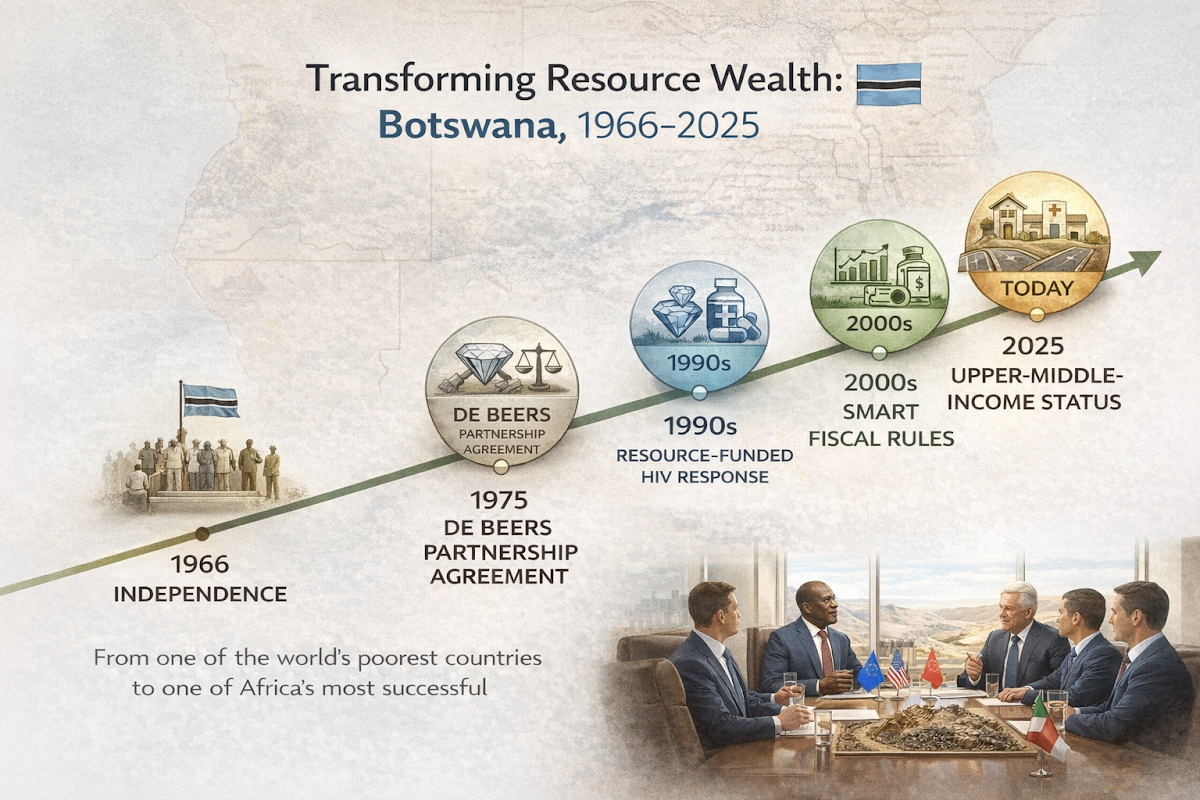 Among resource-rich African nations, Botswana stands as the exceptional case, the country that systematically transformed diamond wealth into sustained development. Since independence in 1966, Botswana has maintained one of the world's fastest growth rates, transitioning from low-income to upper-middle-income status while maintaining democratic governance.
