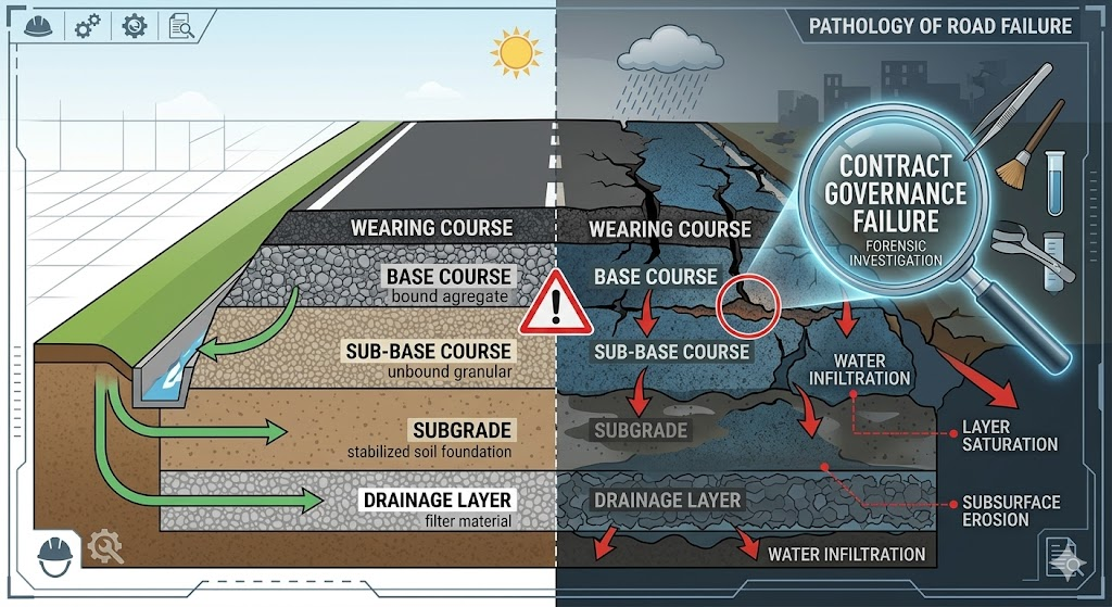 Infrastructure failure in the Global South is habitually misattributed to unexpected rain, overloaded trucks, or poor soil conditions. While these factors play a role, they are rarely the root cause. Instead, they are the final triggers that expose a long chain of decisions, or omissions, that began years earlier in design offices, procurement committees, and project supervision logs. This article proposes that the pothole is a symptomatic failure of contract governance. Through a ten section dissection, we analyze the physical mechanics of hydrostatic pumping and the collapse of California Bearing Ratio in saturated subgrades. We then trace the administrative chain where fiscal pressure, procedural fog, and tailored documentation replace raw field measurement. Finally, we introduce the concept of a Sovereign Infrastructure Database, a digital backbone that enables engineering councils to reclaim oversight through what we term the axiomatic turn: moving from subjective judgment to rule based, real time verification of construction quality.