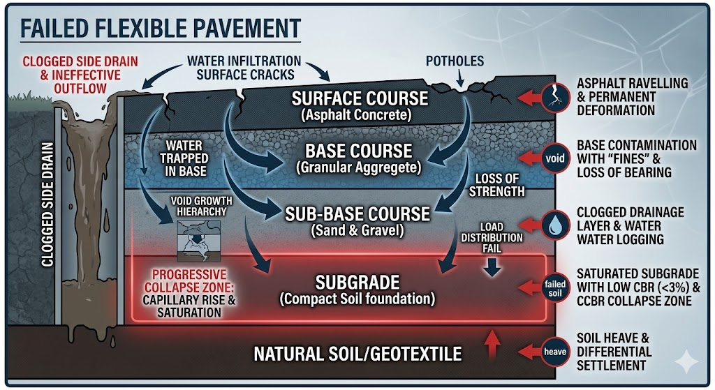 Subgrade Saturated Collapse (CBR < 3%): The terminal failure of the road's foundation soil when moisture eliminates bearing capacity, rendering the entire pavement structure unsupported.