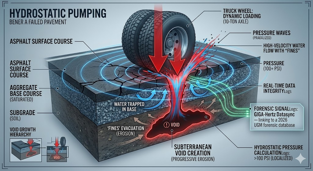 Hydrostatic Pumping (The Fatal Stroke): The high-velocity ejection of soil "fines" through surface cracks, driven by the intense hydraulic pressure of heavy traffic loading.