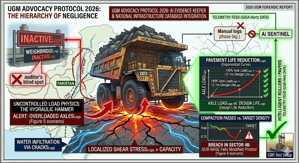 The Hydraulic Hammer: The geometric amplification of stress caused by overloaded axles, which exponentially accelerates the destruction of the pavement's internal anatomy.