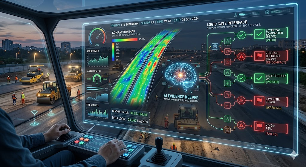 AI Evidence Keeper: A real-time digital oversight system that replaces manual paper logs with unalterable site telemetry from intelligent rollers and pavers.
