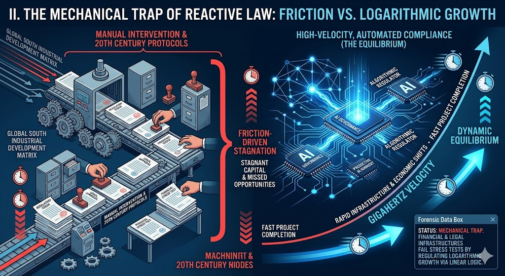 This necessity for synchronized velocity leads directly to the diagnostic failure of our current systems, primarily characterized as the mechanical trap of reactive law. Current institutional stress tests fail to produce results for the betterment of humanity because they are tethered to a static logic that assumes a linear progression of risk. In the Gulf and across the Global South, financial institutions find themselves fundamentally unable to support the rapid industrial shifts that artificial intelligence highlights. This failure occurs because these organizations attempt to regulate a logarithmic growth curve using 20th-century reactive protocols which are designed to address problems only after they have manifested as physical disputes.
