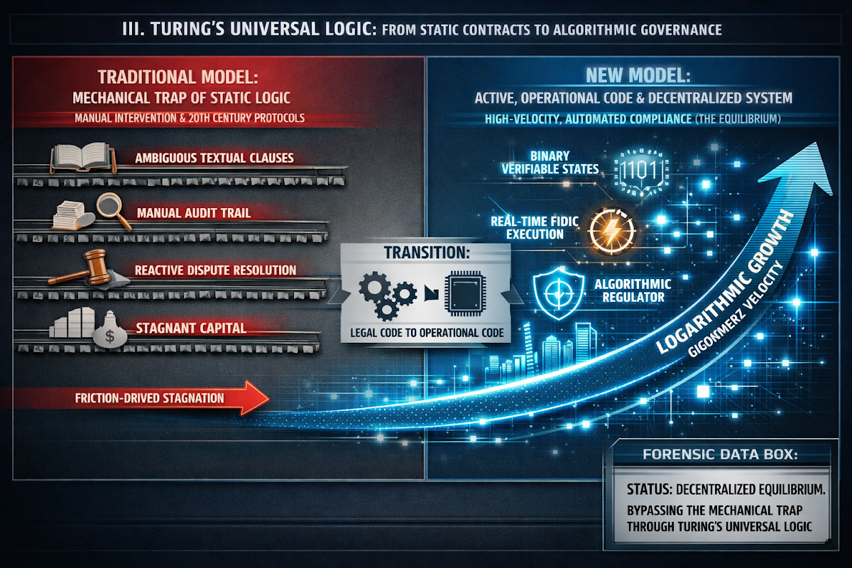 The core of the mechanical trap in current law is the inherent ambiguity of human language, which frequently leads to long-term disputes in the Global South. By applying Turing’s framework of algorithmic logic, we can translate complex FIDIC clauses or investment treaties into binary, verifiable states. This translation reduces the "friction of interpretation" that currently plagues large-scale infrastructure projects. When a regulatory requirement or a payment milestone is defined by a clear logical sequence—if condition A is met, then action B must execute—the room for administrative manipulation or "manual drift" is eliminated. The governance of the project becomes a closed-loop system where the output is determined by the integrity of the initial code.