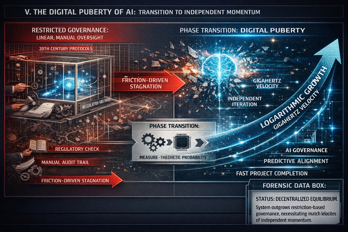 The arrival of this independent state means that this force cannot be restrained through the friction of manual bureaucracy. Historically, the regulator acted as a parent, introducing checks and taming mechanisms to manage the "drift" of the system until it reached a perceived age of maturity. However, in a gigahertz environment, the parent no longer possesses the speed to control the child. When AI identifies infrastructure gaps or mineral wealth across the Global South in real-time, a regulatory framework that requires weeks of manual audit or human signatures becomes a point of terminal failure. The system has outgrown the cage of 20th-century reactive protocols, necessitating a transition to a more sophisticated form of guidance.