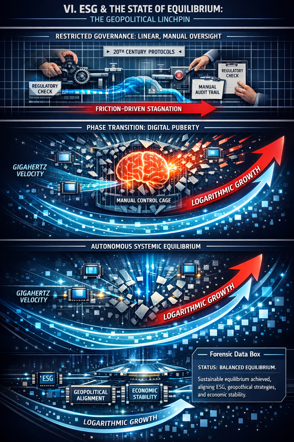 As the development matrix shifts toward a new state of equilibrium, the financial and legal infrastructures must evolve to match the actual position on the ground. We are currently witnessing a form of digital puberty where the tools of production have gained a momentum that renders old taming methods obsolete. The requirement for the modern era is the matching of velocities between industrial development and intellectual governance. Only by recoding our foundational algorithms to account for real-time ethical and social variables can we ensure that rapid growth results in a stable, collective survival rather than a terminal collapse of the civilizational engine. This transition marks the end of the mechanical era and the beginning of a synchronized, algorithmic era of global stability.