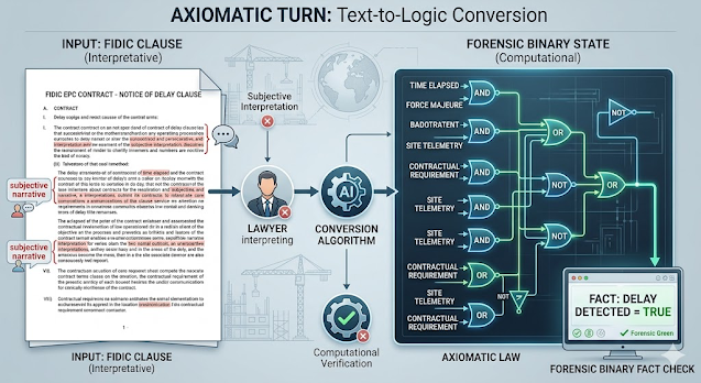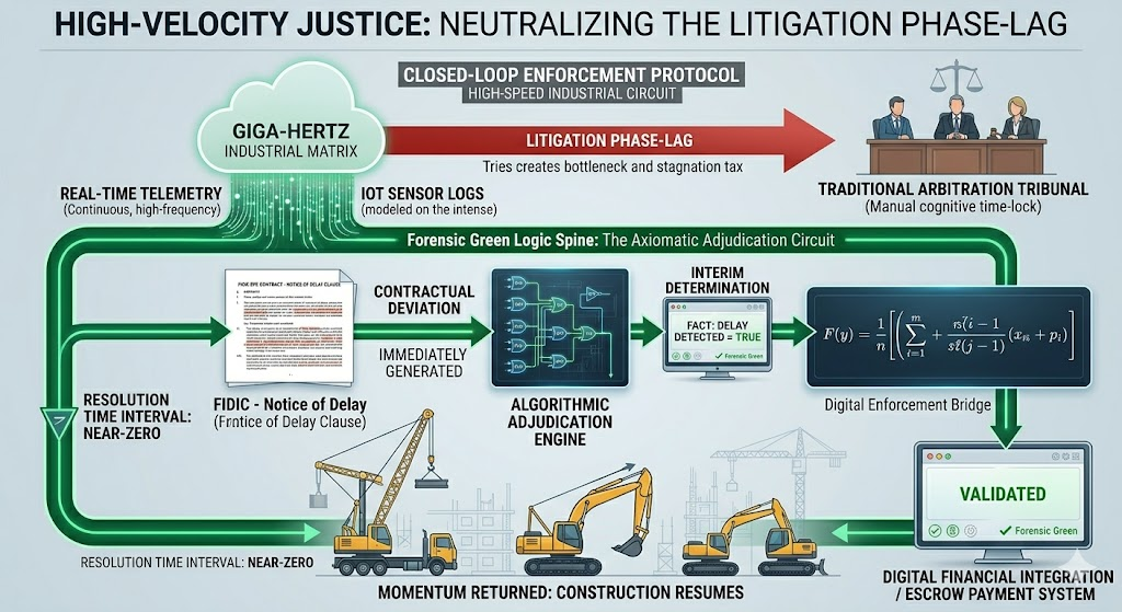 Manual arbitration operates at milli‑hertz cadence while modern infrastructure generates giga‑hertz data streams. This decoupling, termed as Litigation Phase‑Lag, acts as a Stagnation Tax, draining sovereign liquidity and weaponizing procedural delay. This article proposes the Axiomatic Turn: a shift from linguistic ambiguity to binary verifiable states, anchored by cryptographic integrity and overseen by a new professional of the Systems Arbitrator. Through the Turing Evidence Test and a real‑time Logic Spine, we can align legal verification with project velocity, reclaim the development axis, and transform justice from a post‑mortem exercise into a function of industrial momentum.