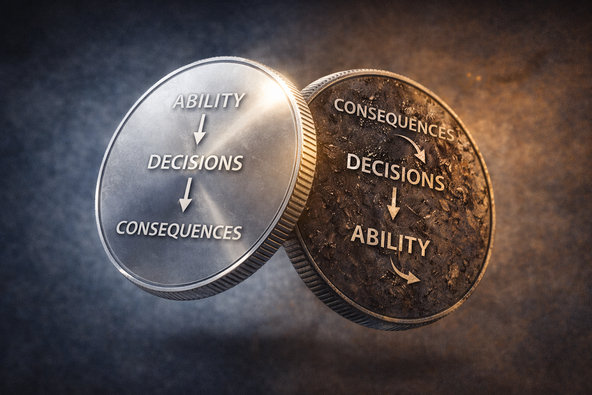 - Consequence. The outcome of a decision. Here, consequences are not final endpoints but new starting conditions. They either refill the reservoir of power or create the pressure for reinvention.