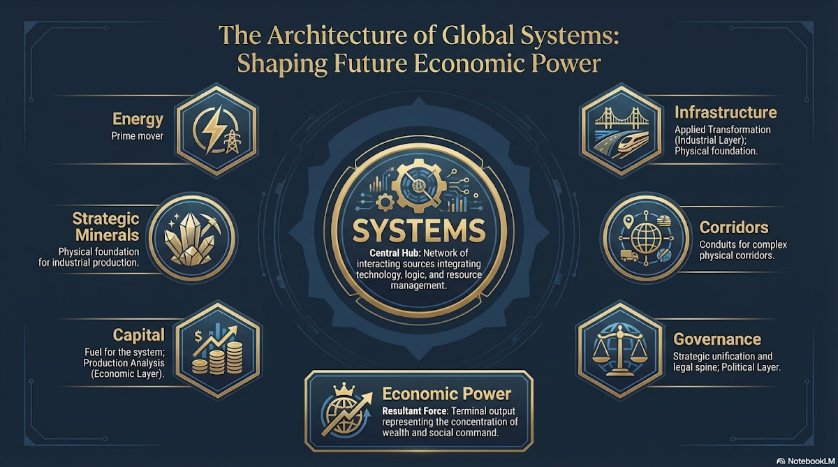 The structure of the global economy is entering a new phase of transformation. For much of the twentieth century, economic geography was largely defined by energy. Control over oil reserves, maritime routes, pipelines, and refining capacity shaped alliances, trade flows, and the strategic priorities of nations.Today, the foundations of economic power are expanding beyond hydrocarbons. The emerging economic landscape is increasingly shaped by the interaction of resources, infrastructure systems, capital flows, strategic corridors, and governance frameworks.