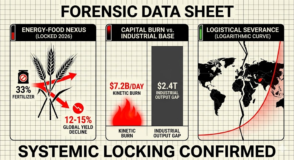 The structural failure of a global system is never a matter of sentiment but a matter of cold and unyielding arithmetic. In this diagnostic, the geometry of the chokepoint dictates the physics of the collapse, creating a scenario where the variables are no longer speculative but mathematically locked. As a Professional Engineer, I observe the Energy Food Nexus as the most critical equation in our current trajectory. With 33 percent of the global fertilizer trade stalled within a 33km aperture for a cumulative period of 60 days, the ability of the global breadbasket to sustain its output has been effectively severed. This delay is a primary coefficient that ensures the 2026 crop yield is now trapped in a 12 to 15 percent decline regardless of any future intervention.