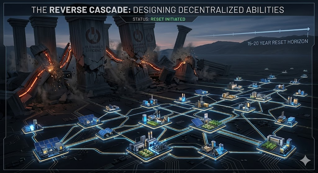 The Reality of Structural Decay Stability is not a return to the status quo but a measurement of a system’s ability to function under load. History, from the Napoleonic wars to the post-WWII reconstruction, proves that structural failures of this magnitude—where the yield point has been surpassed—require a 15 to 20 year reset period. We are witnessing the death of centralized efficiency and the urgent, painful birth of the Reverse Cascade. This phenomenon represents the necessity of building decentralized, local, and resilient "Abilities" from the ruins of a failed, over-extended global architecture.